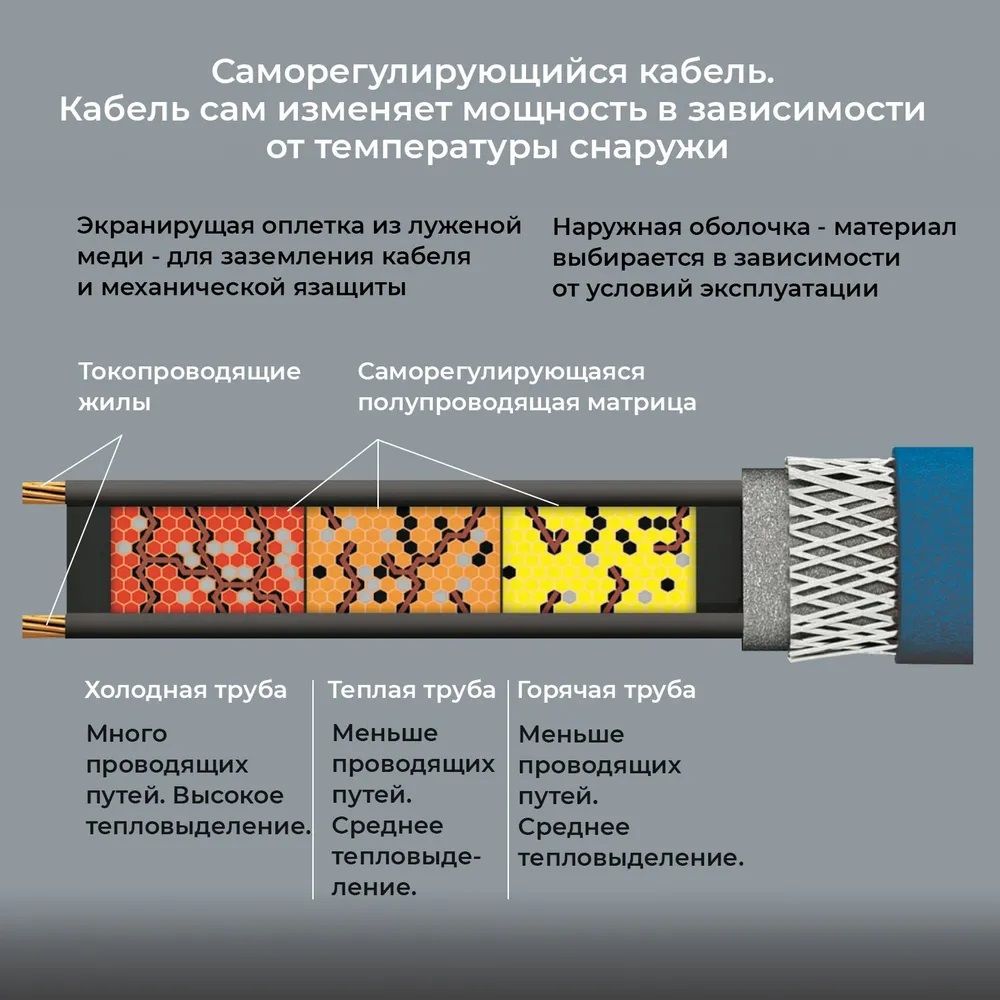 Нагревательная секция для предотвращения замерзания бытовых трубопроводов, устанавливается внутри трубы с водой или другой неагрессивной средой, а также снаружи трубопровода. Тип кабеля: саморегулирующийся. Линейная мощность: 10 Вт/м. Степень защиты: IP68. Соединительная и концевая муфты изготовлены в заводских условиях, надежны и герметичны. Для ввода в трубу используется специальный cальниковый узел входит в комплект. Секции предназначены для обогрева труб небольшого диаметра.