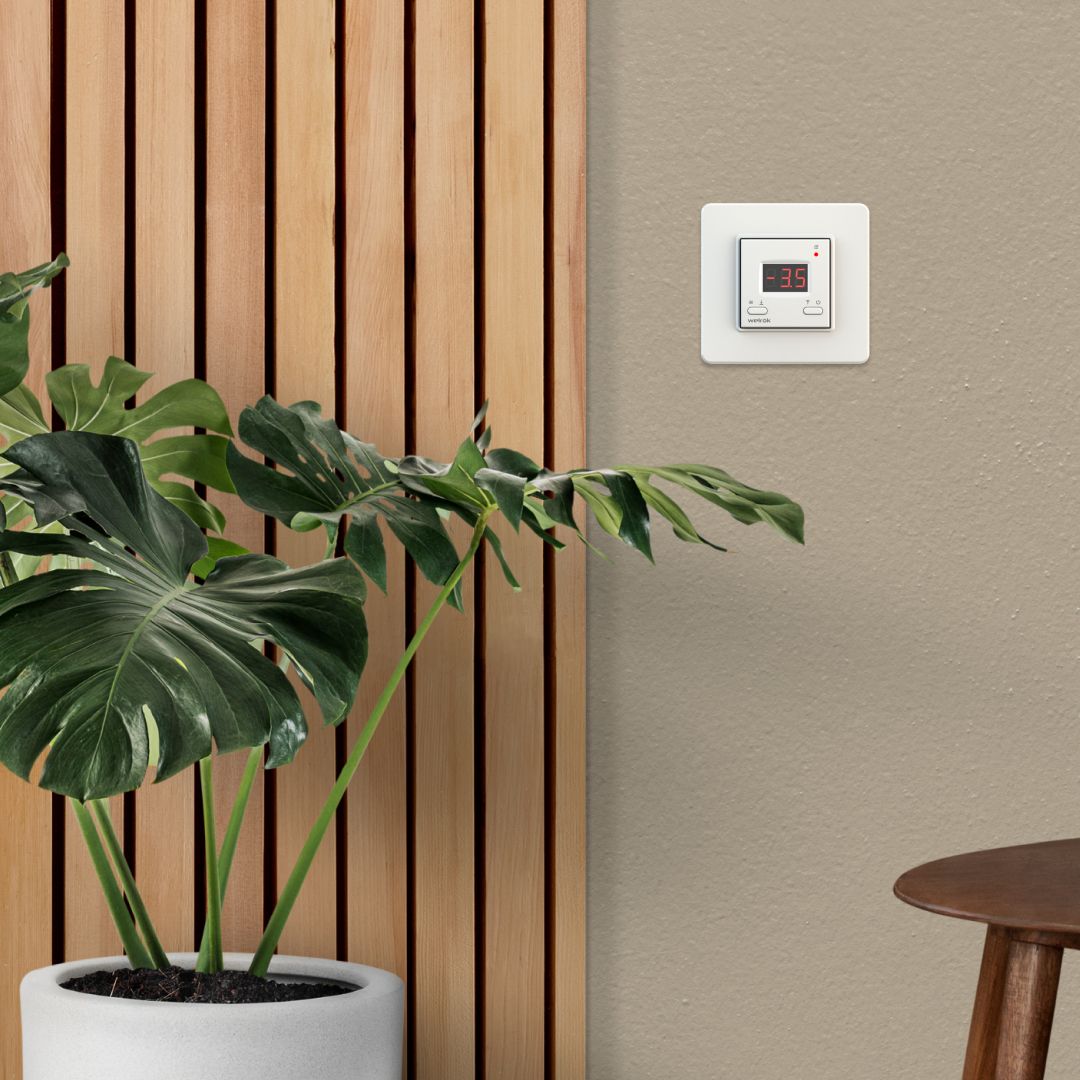 Настройка температуры и навигация по меню осуществляется двумя кнопками и отображается на цифровом экране. Яркость экрана автоматически снижается до 30 % в режиме ожидания для комфортного использования в ночное время и экономии электроэнергии.