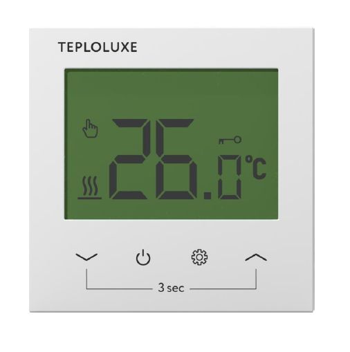 Терморегулятор поддерживает комфортную температуру обогреваемой поверхности и обеспечивает рациональный расход электроэнергии. Терморегулятор обеспечивает управление по двум датчикам температуры: пола и воздуха, как одновременно, так и по отдельности. Терморегулятор может осуществлять управление водяными теплыми полами при использовании термоголовки нормально закрытого типа с управлением 230В. Терморегулятор оснащен информационным жидкокристаллическим экраном, отображающим состояние системы обогрева и сенсорными кнопками управления.
